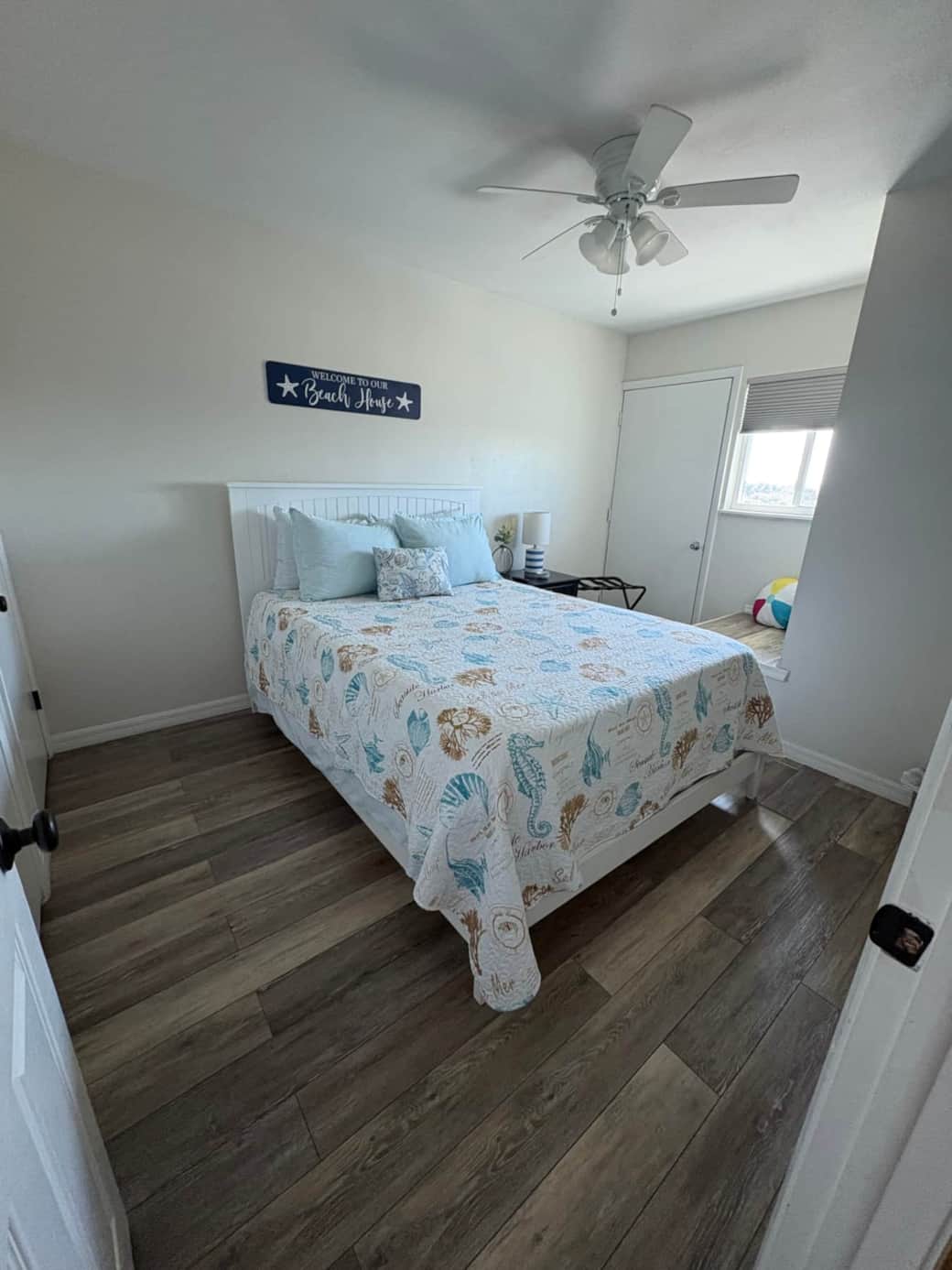 Our end unit sits on the quieter, no-drive end of New Smyrna Beach. It’s bright, comfortable, and intentionally simple. From the balcony, you can see the beach between the buildings. Upstairs, the primary bedroom looks toward the pool and shoreline.